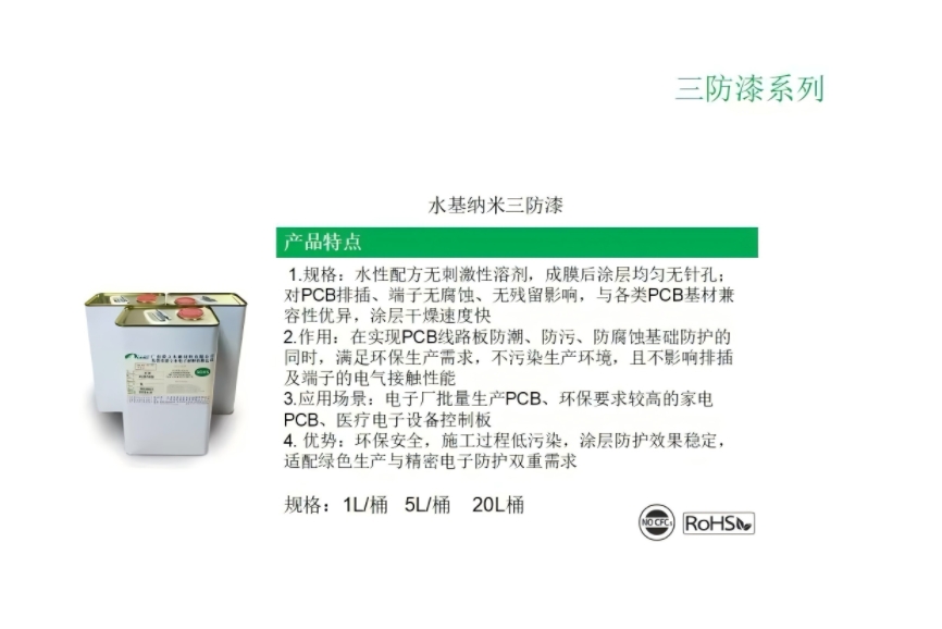 规格:水性配方无刺激性溶剂,成膜后涂层均匀无针孔;对PCB排插、端子无腐蚀、无残留影响,与各类PCB基材兼容性优异,涂层干燥速度快